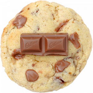 Our classic cookie dough filled with Belgian milk chocolate chunks, stuffed with Dairy milk caramel spread. This cookie is topped with a piece of Dairy Milk chocolate.