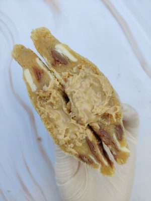 Our classic cookie dough filled with Belgian white chocolate chunks stuffed with a Kinder spread centre. This cookie is topped with a white chocolate drizzle and piece of Kinder Bueno chocolate bar.